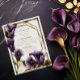 Nosso cartão de detalhes florais de guião clássico será o sucesso da sua suíte de casamento! Nossa design inclui um belo quadro geométrico de abstrato, enfeitado com lírios púrpura escuros pintados. O texto inclui linhas de assunto elegantes para caligrafia que você pode manter ou excluir e criar. Use e edite campos de texto atuais para o evento e altere as cores ou o estilo da fonte para o efeito desejado. Este design inclui um Código QR de simulação que você pode guardar para decoração ou excluir e substituir por seu próprio endereço de casamento ou simplesmente incluir seu endereço de site de casamento para que o convidado possa encontrar instruções. Compre toda a nossa suíte de casamento Elegante Calla Lily.