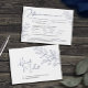 simples casamento de uma filial de arte botânica de linha azul com RSVP e opções de refeições em papel branco com arte de linha azul e texto azul e preto. Design simples de folha. Estão disponíveis convites e outros itens e opções de cores correspondentes. © Original folha desenhando linha e design por Sarah Trett para www.mylittleedenweddings.com no Zazzle.