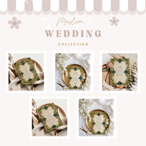 An opulent Islamic wedding design featuring a teal and gold arched frame inspired by mosque architecture and Persian artistry. With intricate floral motifs and geometric symmetry, this invitation exudes elegance, spirituality, and timeless cultural refinement — ideal for a luxurious Islamic wedding.