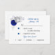flores azuis reais e prateadas com cartão RSVP branco de escolha de refeição