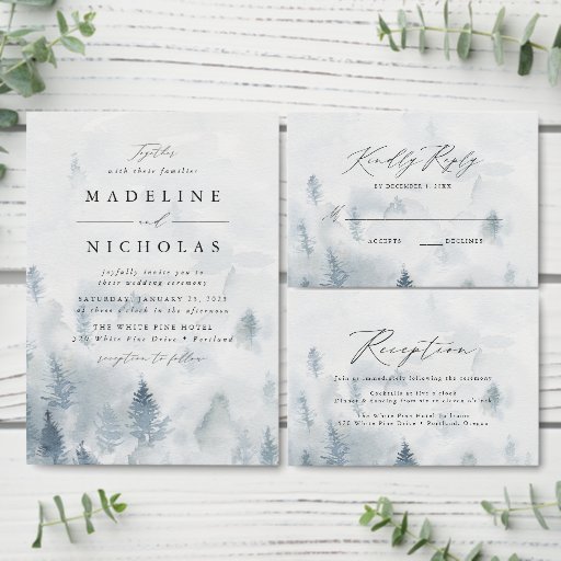 Elegante, cartão de casamento de RSVP de inverno com cinzas negras e pinheiros e montanhas de cor azul escura. Personalize os cartões RSVP de casamento da pinheira de inverno adicionando sua data RSVP, o personalizado aceita/declina o texto e as opções de janto. A placa RSVP de escolha da refeição do casamento reverte para um fundo azul-água marinho. Projetado para coordenar com a nossa coleção de casamento Elegante da Floresta de inverno.