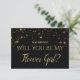 Peça à sua sobrinha, parente, filha de uma amiga, ou garota especial na sua vida para estar na sua festa de noiva com esta bela carta de proposta de florista. Este cartão tem um lugar para você escrever uma mensagem especial para sua florista dizendo que você realmente quer que ela faça parte do seu casamento. Projetado como parte de nossa suíte Shimmering Sparkles Wedding, apresenta um elegante design de estrelas cor-de-rosa e douradas ou brilho com texto dourado sobre fundo preto.