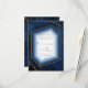 Um fundo de aquarela em tons de azul real a marinho é tocado por um abstrato de linhas de ouro finas e efeitos luminosos brilhantes para criar as peças desta bela suíte de casamento. O cartão 'RSVP' do casamento mostrado aqui também apresenta um belo quadro de gradiente para segurar todo o seu texto. Adicione facilmente seus próprios nomes, data do casamento e detalhes do evento usando o modelo fornecido. Procure ID867 para ver outras peças e opções de cores para este conjunto.