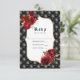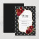 Convite de casamento gótico vermelho, preto e dourado com rosas vermelhas e um fundo tufado de luxo de diamante.