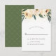 Um lindo design de RSVP com tipografia elegante e uma borda de flores cor-de-rosa em aquarela. Por trás das flores há uma imagem de confetes dourados. Estes cartões invertem para um padrão branco simples em um fundo verde.