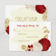 Flores vermelhas escuras e brancas românticas com folhas de ouro cartão de resposta de casamento botânico. Os detalhes de brilho são simulados.