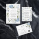 Hígrangas azuis e brancas, rosas brancas e verde claro. Personalize com suas próprias informações.