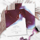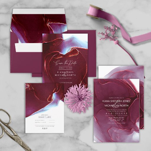 Um fundo de abstrato que lembra a tinta líquida em tons de burgundy profunda através de ciano e branco é o pano de fundo para elegantes textos manuscritos e layouts modernos de design nos pedaços desta bela suíte de casamento. O cartão RSVP de casamento mostrado aqui apresenta as informações acima e uma modelo para adicionar suas próprias informações pertinentes de evento. Procure ID762 para ver todas as peças de coordenação neste conjunto.