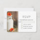 Um cartão RSVP de casamento desenhado com um tema de casamento rústico com um jarro de leite branco e flores laranja sentados em um celeiro em algum feno.