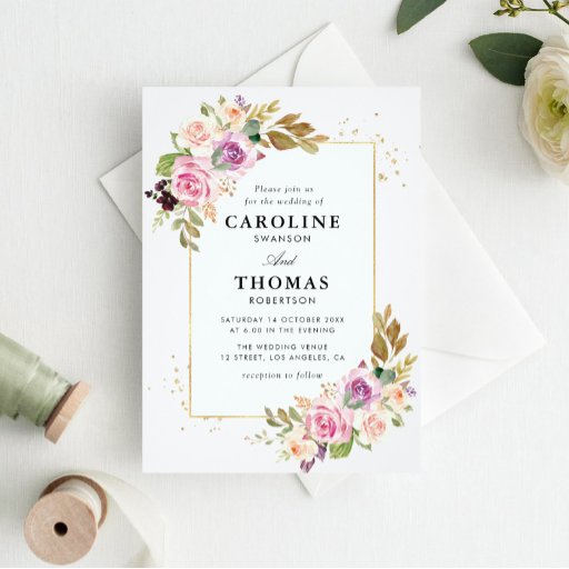 Um cartão de informações de casamento com lavanda roxo e flores de aquarela para sua recepção de casamento. você pode personalizar o texto e a cor para corresponder ao seu próprio tema de casamento.