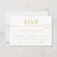 Esta é uma elegante placa RSVP de casamento, com uma linha de ouro com círculos concêntricos e uma folha no lado direito e um ponto no lado esquerdo, todos posicionados sobre um fundo branco. Na parte traseira da placa, há um padrão diagonal mostrando os nomes do casal em ouro em uma superfície branca, adicionando um toque extra de sofisticação e graça ao design geral. É importante observar que, se os nomes no verso ocuparem mais ou menos espaço do que o desejado, é possível personalizar o cartão aumentando ou diminuindo o tamanho do texto em conformidade.