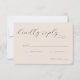 This elegant wedding RSVP card features a soft, blush pink background with sophisticated cursive typography that exudes timeless charm. The minimalist design focuses on clean lines and ample space for personalization, making it perfect for couples who prefer an understated yet refined aesthetic. With its simple color palette and graceful script, this card conveys a warm and inviting tone, ideal for setting the mood for your special day. It’s designed to seamlessly fit into any wedding theme while allowing you to add your unique details effortlessly.