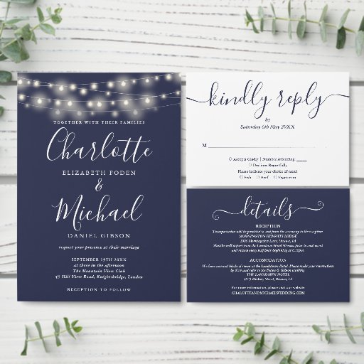 Cartão RSVP Marinho Blue Script String Luzes Casamento
