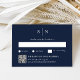 Estes elegantes e modernos cartões de resposta RSVP de casamento azul-escuro apresentam um simples design de texto branco que exumenta o estilo minimalista. Adicione suas iniciais ou monograma para torná-las completamente suas. Este cartão de resposta do casamento serve como uma combinação de rsvp tradicional que seu convidado pode retornar, assim como um código de QR para aqueles que preferem o rsvp on-line.