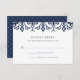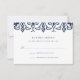 Projetado para coordenar com o nosso casamento e convites para eventos de Marraquexe, este cartão de resposta elegante em azul-marinho clássico e branco apresenta uma fronteira geométrica superior inspirada por Marrocos. Adicione a data de RSVP e o texto de resposta no marinho correspondente.