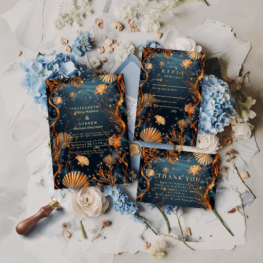 Dive into a moody, luxurious underwater world with this Midnight Deep Sea Gold Nautical Wedding design. Rich navy tones create a dramatic ocean backdrop, accented by shimmering gold seashells, flowing seaweed, and rising bubbles for an enchanting, sunken-treasure aesthetic. Perfect for couples who want a bold, elegant nautical theme with a touch of mystery and ocean romance. Fully customizable with your wedding details, this underwater-inspired artwork brings striking depth and character to your celebration.