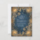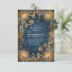 This striking celestial wedding design radiates luxury and mystique with a deep midnight blue background and intricate golden sun motifs. The swirling baroque details and glowing accents create a feeling of cosmic grandeur — perfect for celestial, gothic, or art nouveau-inspired weddings seeking a bold yet timeless look.