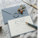 This elegant RSVP card features a delicate botanical leaf illustration with a modern, minimalist design. The dusty blue background provides a sophisticated and serene feel, perfect for a wedding or special event. The monogram and names are elegantly displayed, creating a personalized touch for your guests. This card is designed to seamlessly complement your wedding invitations, ensuring a cohesive and memorable stationery suite for your big day.
