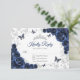 Navy silver floral Quinceanera RSVP reply card. Features, script font, silver butterflies, watercolor roses and tiara. Perfect for an elegant princess style glam celebration. Personalize with your own details.