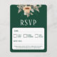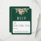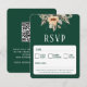 Cartão de resposta RSVP de casamento verde escuro com flores de damascos e folhagem de jardim. Um simples, mas elegante design botânico contemporâneo inspirado no estilo boho vintage. Inclui espaço para código QR e endereço do site de casamento.