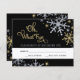 Festa de Natal festiva, mas formal, ou design de cartão RSVP de Festa de Ano Novo apresenta flocos de neve prateados e dourados e "Oh, Que Divertido" na escrita, e texto que pode ser personalizado com sua data de vencimento RSVP. A borda do floco de neve e o script têm uma aparência brilhante texturizada em um fundo preto.