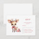 Cartão RSVP com uma ilustração de um adorável veado bebê. Olhos grandes orelhas com cabeça grande e pequenos galhos castanhos. Vestindo um grande arco vermelho. Ao lado de uma pilha de presentes.