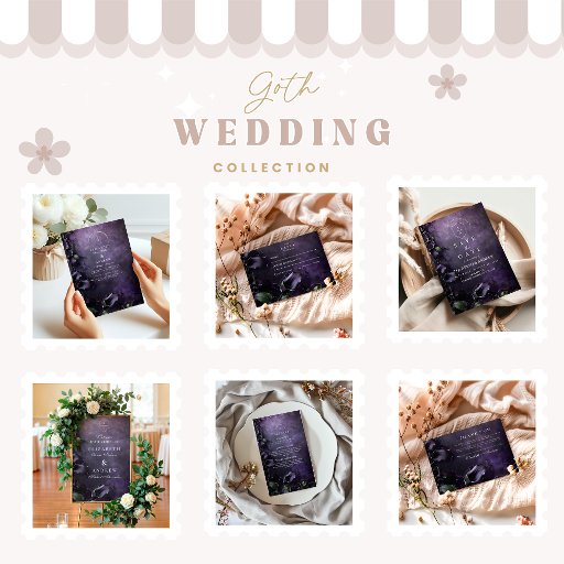 Mergulhe na misteriosa elegância deste design de casamento gótico violeta escuro, onde lírios de calla mórbidos se torcem através de videiras sombrias em um pano de fundo roxo texturizado. Com seu ousado contraste e romance de outro mundo, essa design é perfeita para casamentos de Halloween, casais alternativos, ou qualquer um atraído por temas mágicos e encantados.