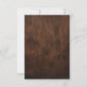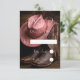 Uma imagem lindamente composta captando a essência de um casamento country, apresentando um par de botas castanhas bem detalhadas, em conjunto com um chapéu de cowboy de cor rosa. Colocada contra um pano de fundo robusto de couro; também uma textura de couro na parte de trás da carta, a cena evoca charme, tradição e elegância ocidental — perfeita para a noiva ou noivo moderno que está trazendo um pequeno talento rural para o seu grande dia.
