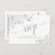 Estes bonitos cartões RSVP facilitarão a resposta dos seus convidados ao convite para o casamento. Eles apresentam um design elegante com uma caligrafia verde de sábio em um fundo branco, e cinzas florais de prata e espirros nos cantos. A parte de trás do cartão é um formulário para os convidados preencherem e retornarem indicando se podem ou não ir, o número de convidados que estão trazendo, e a escolha das refeições. Também há espaço para um site para que seus convidados possam responder online se for mais conveniente para eles.
