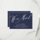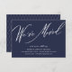 Azul marinho Mudamos o novo anúncio de endereço com uma fonte moderna de script com uma coordenação de volta.