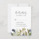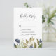 Esta simples placa RSVP verde de outono é perfeita para um casamento outono. A design moderna rústica apresenta folhas azuis marinhos, verdes-sábios e douradas com espirros de flores azuis escuras.