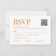 Cartão RSVP de casamento Elegante cor de laranja de cor de laranja de sol com um código de QR digitalizável para o site e 3 opções de refeições editáveis. O exemplo inclui cardápios de carne, peixe e vegano, mas pode ser mudado para qualquer outro texto. Personalize com seu próprio texto.