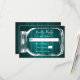Teal wedding RSVP card featuring a mason jar and burlap hearts against a rustic wood background.
