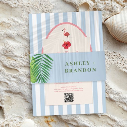 This RSVP card brings bold retro charm to your tropical wedding suite. Featuring classic blue stripes paired with a vibrant pink tropical flower, the design feels playful, coastal, and full of island-inspired personality. Perfect for beach, destination, or summer celebrations, this response card adds a fun yet stylish touch while keeping your stationery beautifully coordinated. Fully customizable for meal choices, attendance, and special notes.