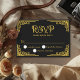 A matching RSVP card designed in the Cinematic Vintage style and gold and black with subtle filmgrain/dust overlay. Completes your editorial wedding suite with a cohesive, nostalgic look. Fully editable. The card has a decorative frame and vintage font in faux gold.