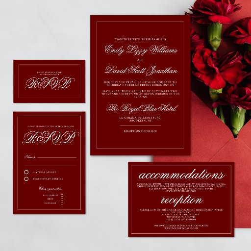 Clássico tradicional vintage elegante estilo crimson red calliographic script personalizado cartão de resposta de casamento. Este produto pode ser facilmente personalizado. Se precisar de ajuda para a personalização do produto, por favor, envie-me uma mensagem via Zazzle.