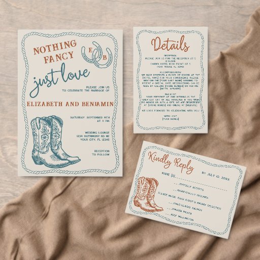 Simple rustic hand-drawn western style "nothing fancy just love" wedding design with rope frame and cowboy boots, for a casual wedding or elopement celebration.