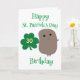 Uma Rua engraçada. Cartão de aniversário do Dia de Patrick que pode ser personalizado com qualquer idade para ele ou para ela. Tem uma batata engraçada segurando uma folha de trevo. Uma mensagem de aniversário engraçada dentro o cartão para seu destinatário, mas também pode ser editada. Uma Rua engraçada, o cartão de aniversário do Patrick.