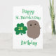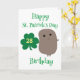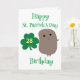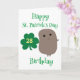 Uma Rua engraçada. Cartão de aniversário do Dia de Patrick que pode ser personalizado com qualquer idade para ele ou para ela. Tem uma batata engraçada segurando uma folha de trevo. Uma mensagem de aniversário engraçada dentro o cartão para seu destinatário, mas também pode ser editada.