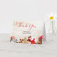 Obrigado por cumprimentar o cartão com uma fotografia rústica. Um conselho de madeira marrom-claro com vários elementos de Natal ao longo do fundo. Presentes de Natal, uma estrela, uma árvore de Natal dourada, chapéu de inverno, renas, bolhas e algumas frutas de Natal.