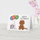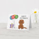 Design do tema de aniversário bonito com a ilustração original de Destei de um cão da raça Cavalier King Charles Spaniel de cor rubi fofo. Ao lado do cão há balões coloridos de aniversário amarrados num osso de cão e uma caixa de cor roxa e amarela. O fundo tem um padrão lúgubre de confete pastel colorido sobre um fundo branco. Há também uma área de texto personalizável que agora diz: "Feliz aniversário!".