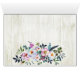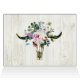 Ferida floral russa boêmica e crânio de vaca longo sobre cartões de agradecimentos de fundo de plâncias de madeira lavadas em branco.