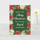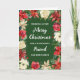 Feliz Natal para a amiga e sua carta de família com flores rústicas de aquarela e fundo verde da floresta.