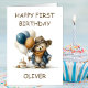 Celebrate a little one’s big milestone with this adorable rustic teddy bear 1st birthday card. Dressed in a shady hat and burnt orange scarf, the sweet bear stands beside a one-candle birthday cake while holding a bunch of balloons; perfect for delivering heartfelt birthday cheer.