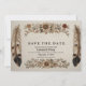 Esta imagem elegante é um cartão em estilo vintage com a frase "SALVE A DATA" numa fonte simples de serifa. O texto é emoldurado por ilustrações detalhadas e feitas à mão de flores, folhas e penas grandes em tons terrosos. O design geral rústico e boêmio é perfeito para um convite de casamento ou evento especial. Preencha com as suas informações para o seu dia especial.
