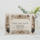 Este elegante imagem é um cartão em estilo retrô com a frase "SAVE THE DATE" em uma fonte serif simples. O texto é emoldurado por ilustrações detalhadas e desenhadas à mão de flores, folhas e grandes penas em tons terrosos. O design geral rústico e boêmio é perfeito para um convite de casamento ou evento especial. Preencha com seus detalhes para o seu dia especial.
