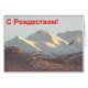Uma águia-careca voa perto da faixa de Chugach coberta pela neve perto de Anchorage, AK. O texto cirílico com a menção "S Rozhdestvom" (С Р ж д е о с т в ом- Uma saudação de Natal russa) aparece em vermelho.
