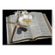 Dog tags militares, flores de orquídea e cruz no Salmo 23.