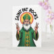 This card shows Saint Patrick centered on a bright white background, standing in emerald green robes with a matching mitre decorated in golden Celtic-style patterns. A warm yellow-and-orange halo radiates behind his head, framing his wide grin and flowing white beard in a way that feels friendly and a little flirty, like he’s posing for someone he adores. Both hands are lifted near shoulder height, and his fingers form peace signs that read as an easygoing “we’re in this together” gesture 💚. Above him, the phrase “SAINT PAT ROCKS” arches across the top in large, dark lettering that stands out sharply against the white space. The robe details use rich gold accents and repeating motifs that add texture and a dressed-up look without crowding the scene. The strong outlines and simple shapes keep the figure crisp and graphic, while the warm halo colors add a cozy glow around his face ☘️. The final look is a single central character with green-and-gold clothing, a sunburst halo, raised peace-sign hands, and arched headline text at the top.