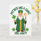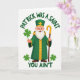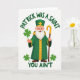 This card features a full-body cartoon-style Saint Patrick figure centered on a white background, dressed in deep emerald robes with gold trim and dotted accents. He wears a matching tall hat topped with a small gold cross, and his flowing white beard and rosy cheeks frame a wide, open smile that feels like it’s aimed at a close friend. In his left hand he holds a bright four-leaf clover ☘️, while his right hand grips a curved gold crozier that arcs alongside his body. Above him, green hand-lettered text curves in an arch reading “PATRICK WAS A SAINT,” and below, the phrase “YOU AIN’T” sits in the same green lettering for a cheeky contrast. The warm greens and golds against the white space make the figure stand out, like a friendly tease shared between pals 💚. Two small shamrocks sit near the bottom on either side of the lower line, balancing the layout with simple green accents.